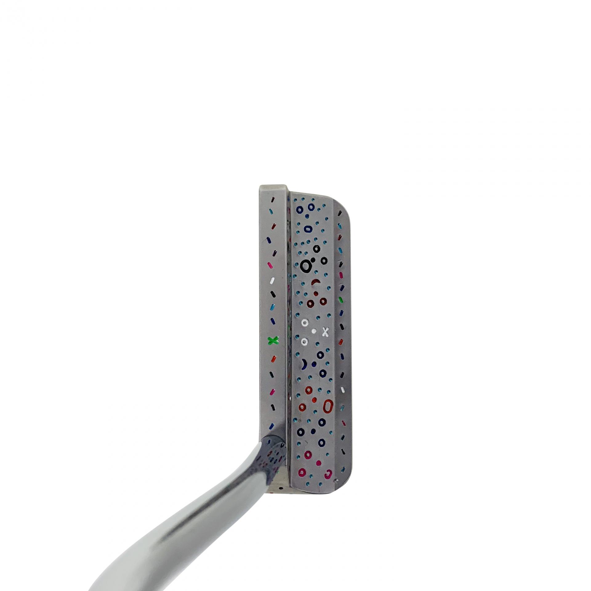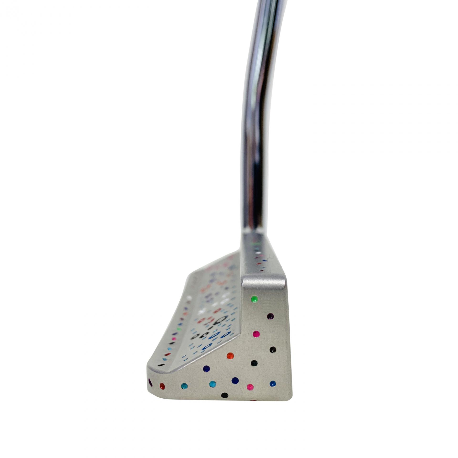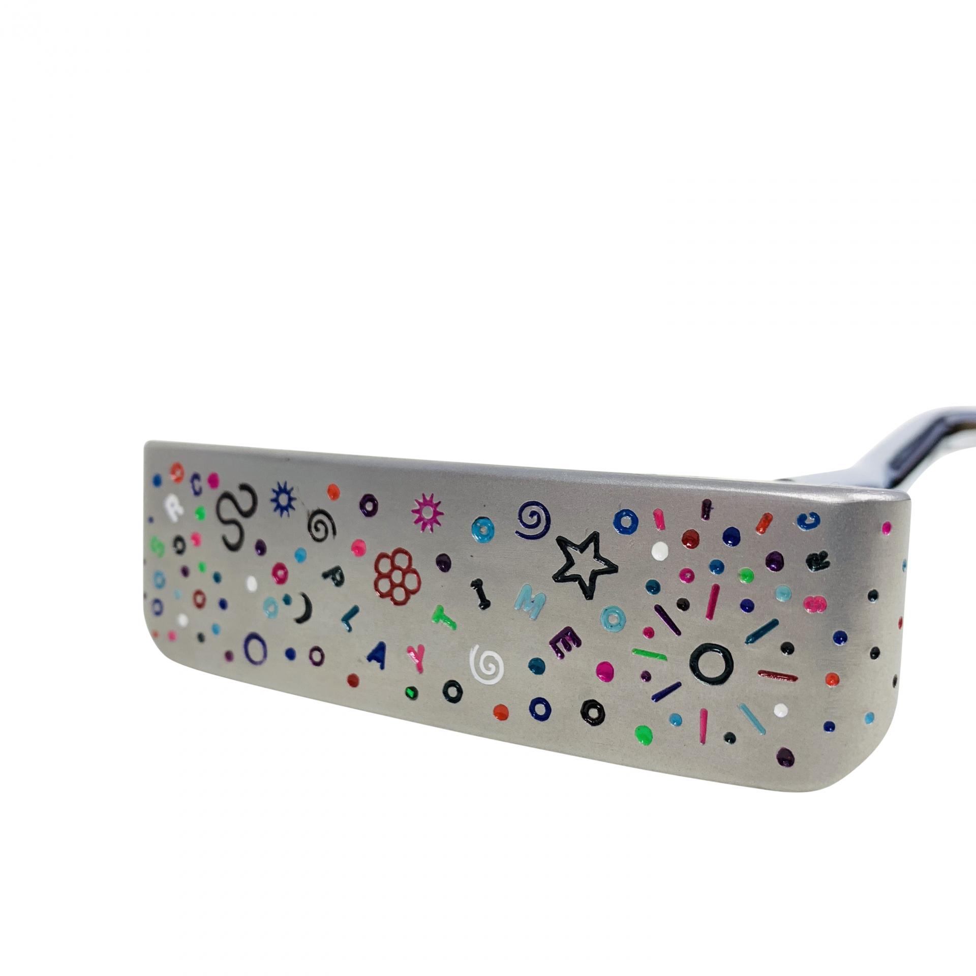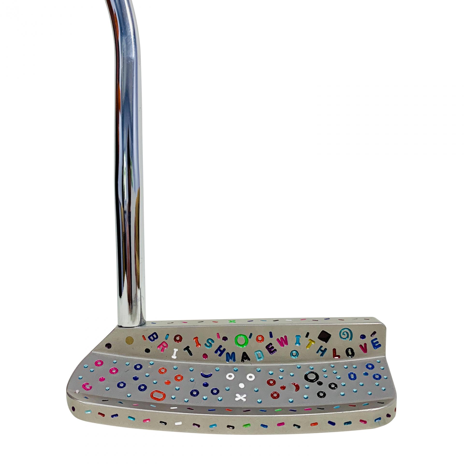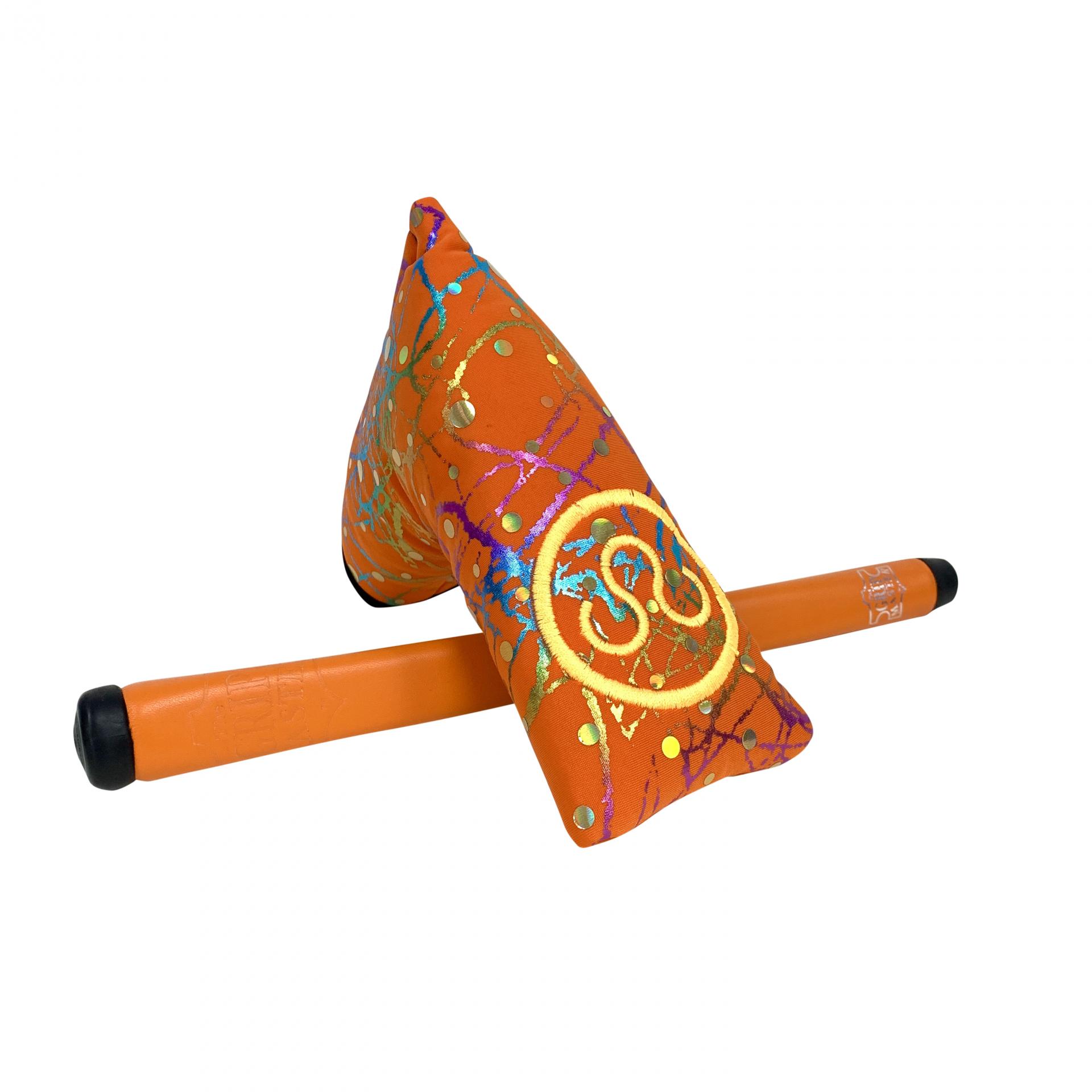 SBG blade hand stamped by Scott, a unique piece. Milled from a single billet of 304 British stainless steel. A perfectly faced balanced putter. Hidden in the crazy stampings are faces. Complimented with our splattattack orange headcover and grip.